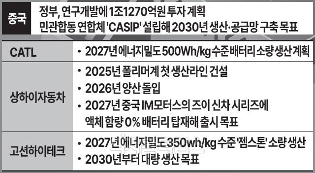 중국 배터리업체들의 행보는 중국 정부의 전폭적인 지원이 주요 요인으로 꼽힌다. 중국 국무원 국유자산감독관리위원회와 국가에너지관리국 등은 올해 1월 전고체 배터리의 생산과 공급망 구축을 2030년까지 완료한다는 목표로 민관합동 연합체인 'CASIP'를 설립했다.