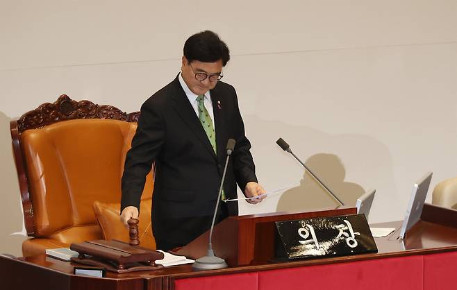 | ▲ 우원식 국회의장이 4일 오후 서울 여의도 국회에서 채상병 특검(순직 해병 수사 방해 및 사건 은폐 등의 진상규명을 위한 특별검사의 임명 등에 관한 법률안)을 재석 190인 중 찬성 189표, 반대 1표로 가결되었음을 선포하고 있다. |