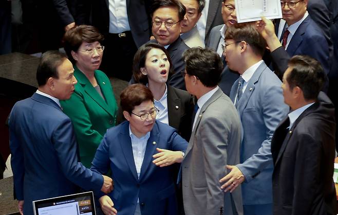 | ▲ 채상병 특검 필리버스터 중단 요청에 아수라장된 국회 ⓒ 유성호 |