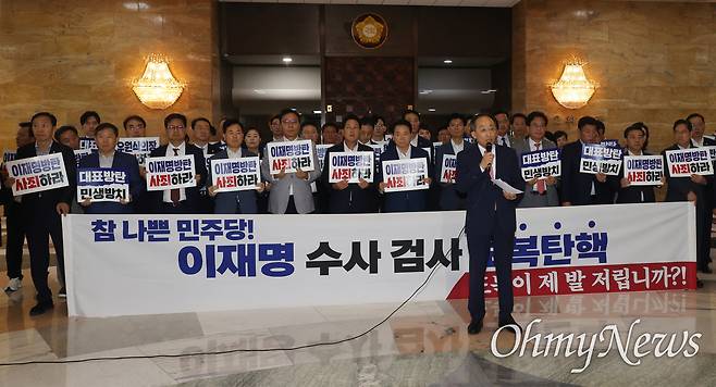 | ▲ 더불어민주당 이재명 전 대표와 소속 의원들이 4일 오후 서울 여의도 국회에서 순직 해병 수사 방해 및 사건 은폐 등의 진상규명을 위한 특별검사의 임명 등에 관한 법률안에 대한 필리버스터(무제한 토론) 종결 동의의 건에 항의하며 국회 단상으로 나온 국민의힘 의원들을 바라보고 있다. |