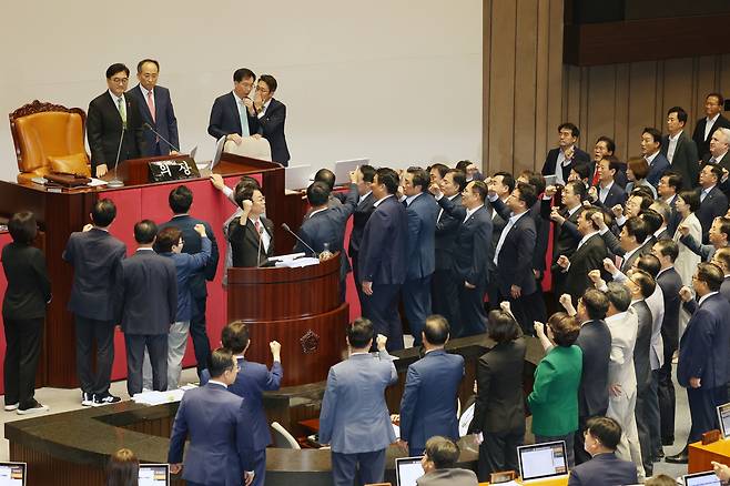 | ▲ 4일 오후 서울 여의도 국회에서 순직 해병 수사 방해 및 사건 은폐 등의 진상규명을 위한 특별검사의 임명 등에 관한 법률안에 대한 필리버스터(무제한 토론) 종결동의의 건을 우원식 국회의장이 표결 처리하자, 국민의힘 추경호 원내대표와 소속 의원들이 우 의장의 의사 진행에 항의하며 "내일 예정된 22대 국회 개원식 불참과 윤석열 대통령에게 개원식 참석하지 않을 것을 요청하겠다"고 입장을 밝히고 있다. |