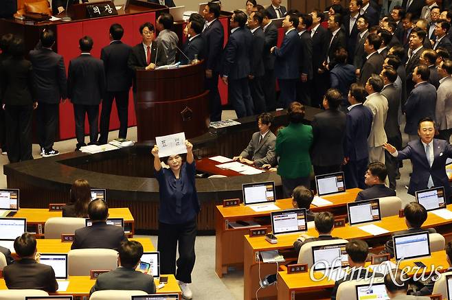 | ▲ 4일 오후 서울 여의도 국회에서 순직 해병 수사 방해 및 사건 은폐 등의 진상규명을 위한 특별검사의 임명 등에 관한 법률안에 대한 필리버스터(무제한 토론)가 24시간을 넘긴 가운데 국민의힘 의원들이 단상으로 나와 토론 보장을 요구하자, 최민희 더불어민주당 의원이 ‘표결’이라고 적힌 종이를 들어보이고 있다. |