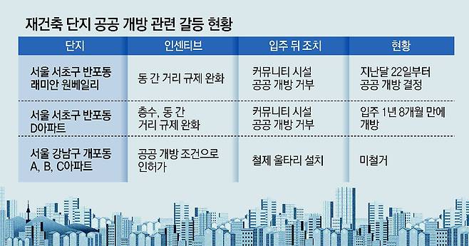단지 일부 시설을 공공에 개방하는 조건으로 용적률 인센티브 등을 받은 재건축 아파트 단지가 입주 뒤 개방 약속을 지키지 않는 사례가 잇달아 나오고 있다. 개방을 직접적으로 강제할 수단도 마땅히 없어 압구정과 여의도 등 한강변 재건축이 진행되면 비슷한 갈등이 반복될 수 있다는 우려가 나온다.