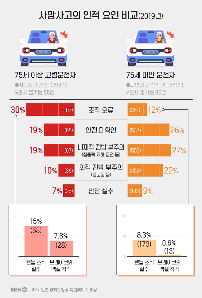 일본 경제산업성은 75세 이상을 고령 운전자로 규정하고 사망사고 원인을 분석했는데, 브레이크와 액셀 페달 조작 오류로 인한 사망사고 비중이 다른 연령층에 비해 높은 것으로 나타났습니다.
