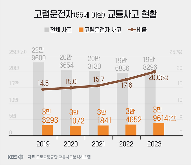 2019년 14.5%였던 고령운전자 사고 비율은 2020년 15.0%, 2021년 15.7%, 2022년 17.6%로 계속 상승했습니다.