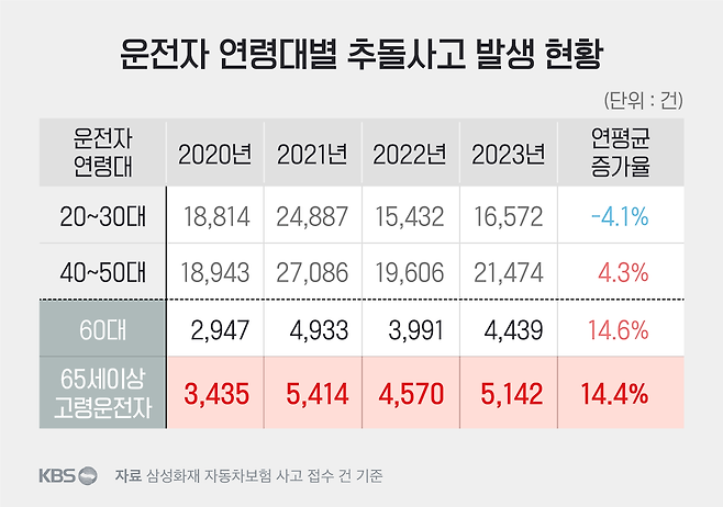 65세 이상 고령운전자 추돌 사고는 2020년 3,435건에서 2023년 5,142건으로 4년간 49.7%(연평균 14.4%) 급증했습니다.