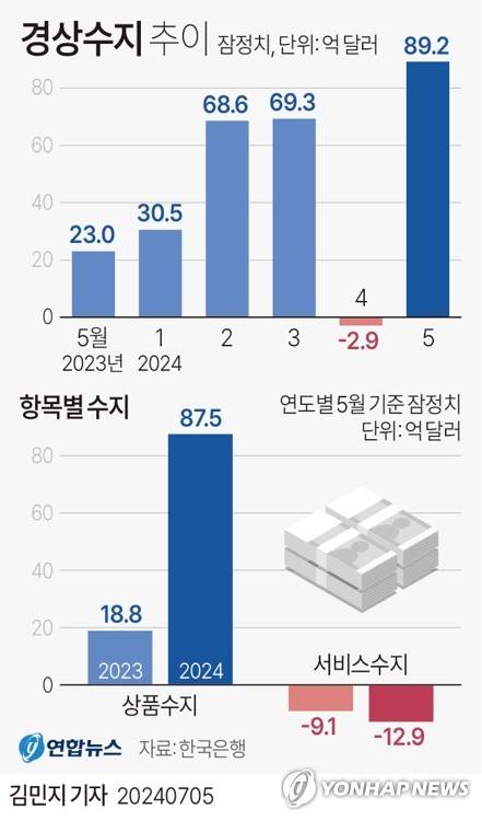 (서울=연합뉴스) 김민지 기자 = 한국은행이 5일 발표한 국제수지 잠정통계에 따르면 지난 5월 경상수지는 89억2천만달러(약 12조3천270억원) 흑자로 집계됐다.