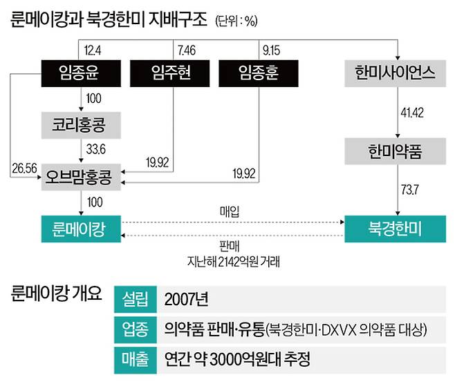 룬메이캉은 홍콩 코리그룹(COREE Group)의 핵심 계열사다. 바이오 연구개발(R&D) 그룹으로 소개돼왔지만 실상은 한미와의 특수관계를 활용해 급성장한 의약품 도매업체로 파악됐다. 오너 일가가 이 중국법인을 통해 그동안 적지 않은 돈을 벌어들인 것으로 추정된다. 공정거래법 규제가 미치지 않는 해외법인을 통해 20년 동안 한해 수천억원에 이르는 일감을 오너 일가에게 몰아줘 주주가치를 훼손한 게 아니냐는 논란이 불거지고 있다.