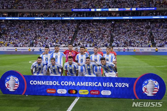 [휴스턴=AP/뉴시스] 아르헨티나(1위) 선수들이 4일(현지시각) 미 텍사스주 휴스턴의 NRG 스타디움에서 열리는 2024 코파 아메리카 8강전 에콰도르(30위)와 경기에 앞서 기념 촬영하고 있다. 아르헨티나는 후반 추가시간 극장 동점 골을 내주며 승부차기에 돌입해 4-2로 승리하고 4강에 올랐다. 2024.07.05.