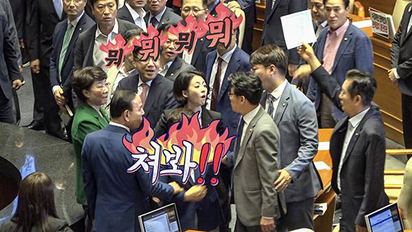 지난 4일 국회 본회의장 채 해병 특검 법안 필리버스터 중단 표결을 앞두고, 국민의힘 의원들이 국회의장석 앞에 몰려가 발언을 할 수 있게 해달라며 고성과 구호를 외쳤다.