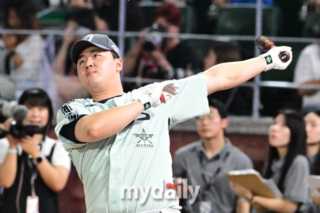[마이데일리 = 곽경훈 기자] 5일 인천SSG랜더스필드에서 진행된 '2024 신한 SOL Bank KBO리그 올스타전' 홈런 더비. NC 김형준이 홈런 더비에 참가해 호쾌한 스윙을 하고 있다.
