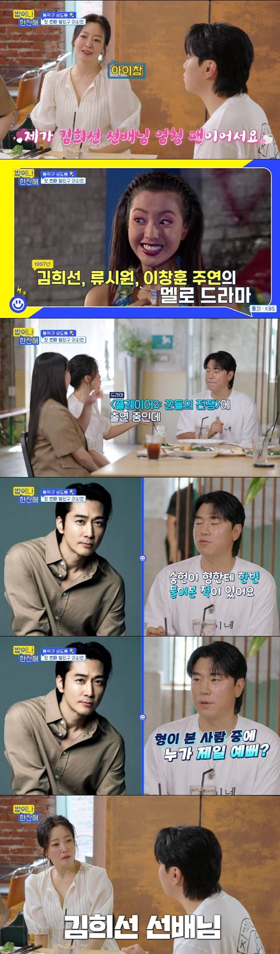 4일 방송한 tvN ‘밥이나 한잔해’에서 밥친구로 출연한 이시언은 송승헌과 드라마 ‘플레이어2:꾼들의 전쟁’에 출연 중이라며 "형에게 ‘형이 본 사람 중에 누가 제일 예뻤어?’라고 하니까 김희선 선배라고 하더라”라며 김희선에게 송승헌의 반응을 전했다.