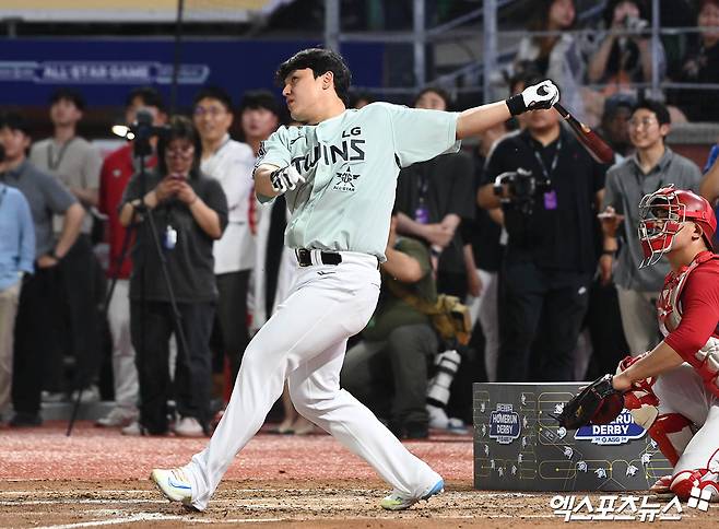 (엑스포츠뉴스 인천, 박지영 기자) 5일 오후 인천 SSG랜더스필드에서 열린 '2024 신한 SOL Bank KBO 올스타 프라이데이' 홈런더비, LG 박동원이 타격하고 있다.