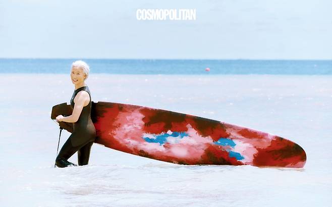 A : 파도는 인생 같아요. 큰 파도, 그러니까 인생의 큰 고난이 왔을 때 뒤로 물러설 순 없잖아요. 부딪쳐야지. 70년 동안 살면서 얼마나 크고 작은 파도들이 있었겠어요. 난 산전수전, 공중전까지 다 겪은 사람이거든.(웃음) 서핑하면서 인생을 담대하게 대하는 태도를 배우죠.