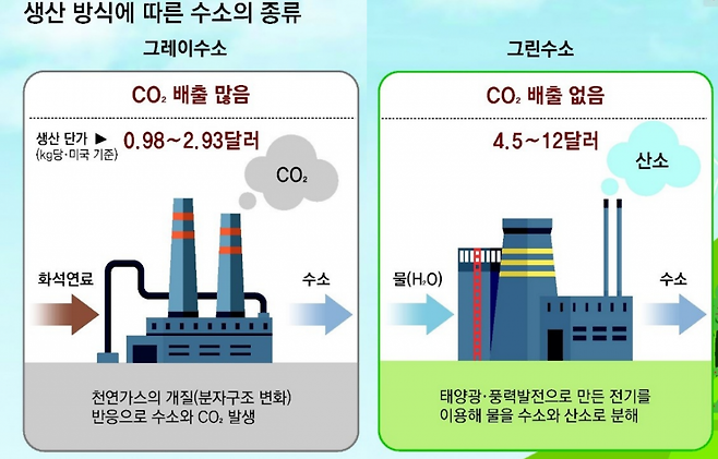 이제 수소는 얼마든지 생산할 수 있지 않냐고요? 무슨 색깔이냐에 따라 다르죠. 수소는 어떻게 만드냐에 따라 색깔을 구별해 이름 붙이는데요. 천연가스로 만든 ‘그레이수소’는 싸게 많이 만들 수 있지만, 무탄소와는 거리가 한참 멉니다.