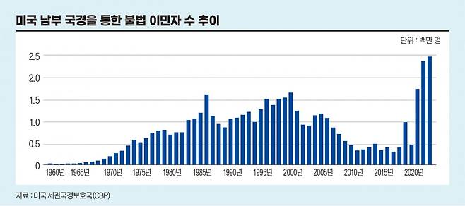미국 세관국경보호국(CBP)에 따르면 2020년 연 40만 건이었던 불법 이민은 2021년 165만 건으로 4배 이상 늘어났다. 이어 2022년 240만 건으로 1년 사이 200만의 벽을 넘겼고 2023년 250만 건을 기록하며 역대 최고 기록을 썼다.