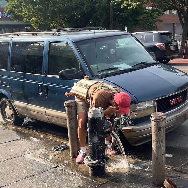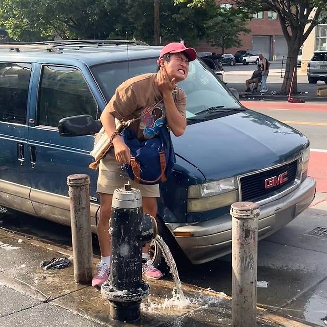 공개된 사진 속 기안84는 미국 길거리에 설치된 소화전에서 난데없이 세수를 하고 있다.