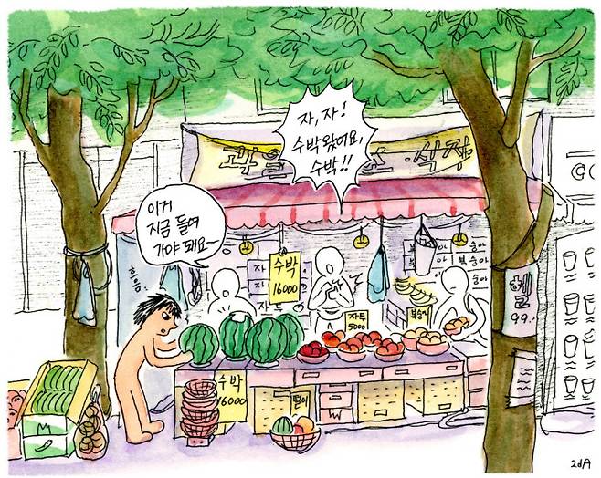 버스를 타고 가는 중에는 갑자기 손이 미끄러져 수박이 ‘퍽!’ 하고 깨지는 상상을 한다. 생각만 해도 끔찍하다. 자리에 앉아 소중한 수박을 두 손으로 단단히 감싸안는다.