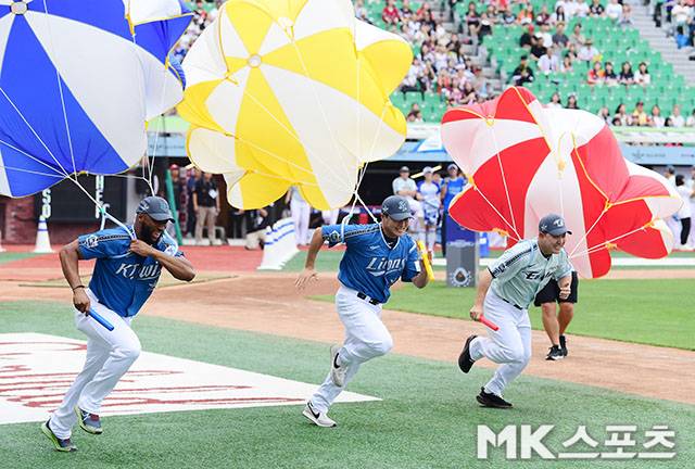 경기에 앞서 KT 로하스와 삼성 이승현, 한화 주현상이 낙하산 레이스를 펼치고 있다.