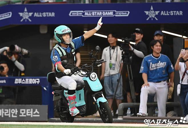 (엑스포츠뉴스 인천, 박지영 기자) 6일 오후 인천SSG랜더스필드에서 열린 '2024 신한 SOL Bank KBO 올스타전' 드림 올스타와 나눔 올스타의 경기, 3회말 1사 드림 황성빈이 오토바이를 타고 타석으로 향하고 있다.
