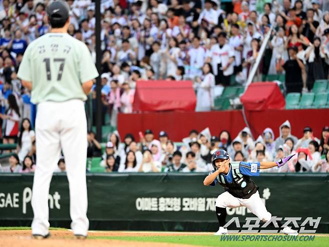 6일 인천 SSG랜더스필드에서 열린 2024 KBO 올스타전, 3회말 드림 황성빈이 안타를 치고 '황성빈 챌린지'
