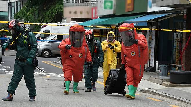 소방은 앞서 고시원과 학원 등이 있는 5층짜리 건물에서 '알 수 없는 기체가 새는 것 같다'는 신고를 받고 출동해 군 등 관련 기관과 합동 조사를 벌였습니다.
