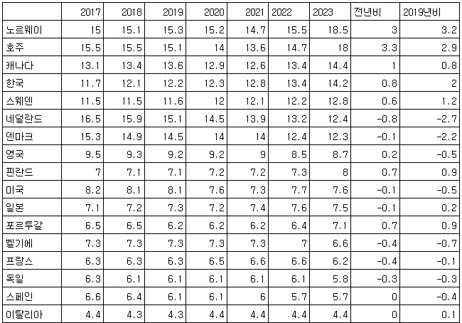 3.3%p(14.7→18.0%) 오른 호주, 3%p(15.5→18.5%) 오른 노르웨이, 1%p 오른 캐나다(13.4→14.4%) 다음이다.