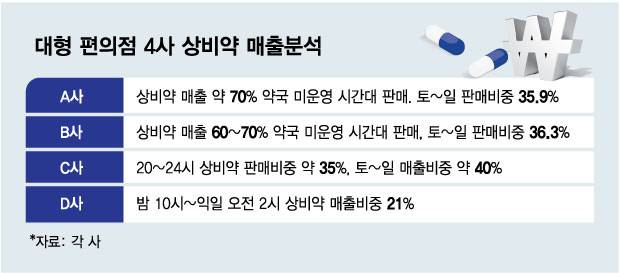 7일 머니투데이가 국내 4개 대형 편의점(CU, GS25, 세븐일레븐, 이마트24)의 올해 상반기 상비약 판매 매출 데이터 분석을 의뢰한 결과 약국이 운영되지 않는 야간 시간대와 주말 판매 비중이 높았다.