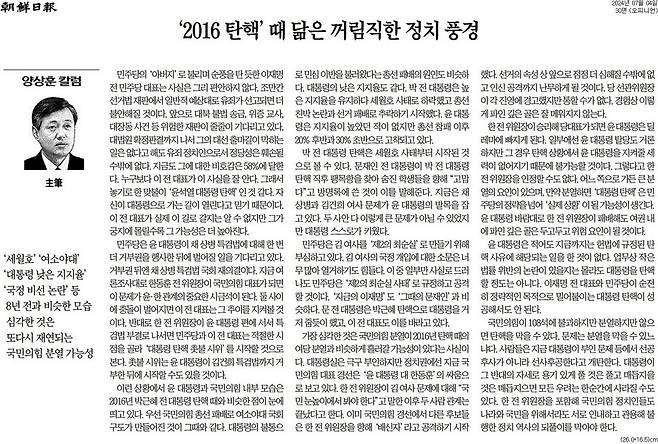 불길한 흐름을 감지한 이른바 보수 논객들이 나서기 시작했습니다. 양상훈 조선일보 주필은 지난 4일치 신문에 “‘2016 탄핵’ 때 닮은 꺼림직한 정치 풍경”이라는 제목의 칼럼을 썼습니다. 총선 패배로 인한 여소야대 국회, 대통령의 낮은 지지도, 국정 비선 논란, 여당의 분열 조짐 등이 2016년과 닮았다는 것입니다. 그런가요?