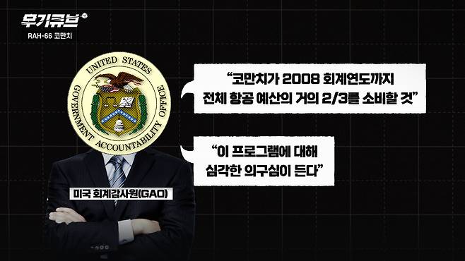 6대에서 2대로 줄어든 시제기가 이제 막 날개를 펴고 첫 비행을 하던 당시 미국 회계감사원(GAO)은 코만치가 “2008 회계연도까지 전체 항공예산의 거의 2/3를 소비할 것”이라며 이 프로그램에 대해 “심각한 의구심이 든다”고 보고 합니다.