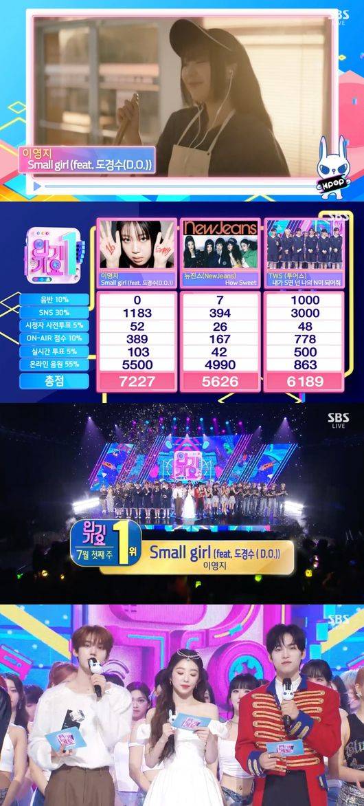 이날 1위 후보로는 이영지의 'Small Girl', 뉴진스의 'How Sweet', 투어스의 '내가 S면 넌 나의 N이 되어줘'가 나란히 올랐다. 이 가운데 이영지가 음원 부분에서 압도적인 점수를 거두며 1위를 차지했다. 출연 없이도 1위를 차지한 쾌거였다.
