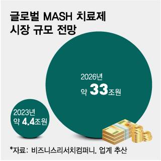 MASH 치료제는 아직 미국 식품의약국(FDA) 허가를 획득한 품목이 3월 허가된 마드리갈 파마슈티컬스 '레즈디프라' 1개 품목에 불과해 시장 선점을 위한 경쟁이 치열한 상태다. 글로벌 시장조사업체 비즈니스리서치컴퍼니와 업계에 따르면 지난해 약 4조4000억원 규모였던 치료제 시장은 오는 2026년 33조원까지 가파른 성장이 전망된다.