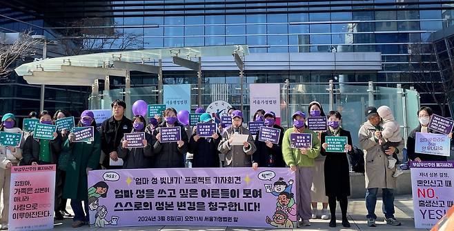 | ▲ 지난 3월 8일(세계 여성의 날) 오전 서울가정법원 앞에서 열린 기자회견. 실제 엄마성 쓰기를 실천한 부부도 아이와 함께 왔다. 발언 중인 김준영씨 모습(가운데). |