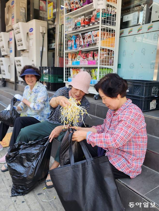 편의점 계단에 앉아 이웃과 콩나물을 나눕니다. 한 움큼 넉넉한 정으로 오늘 저녁은 배부르겠네요.