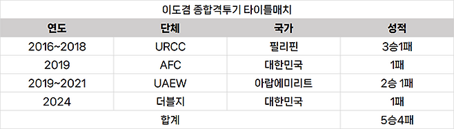 ▲해외 2개 단체 챔피언 ▲대한민국 두 대회 타이틀매치 ▲서로 다른 메이저 단체 출전. 이도겸(34)이 2010년대 중후반부터 종합격투기 페더급(-66㎏)에서 쌓은 경력이다.