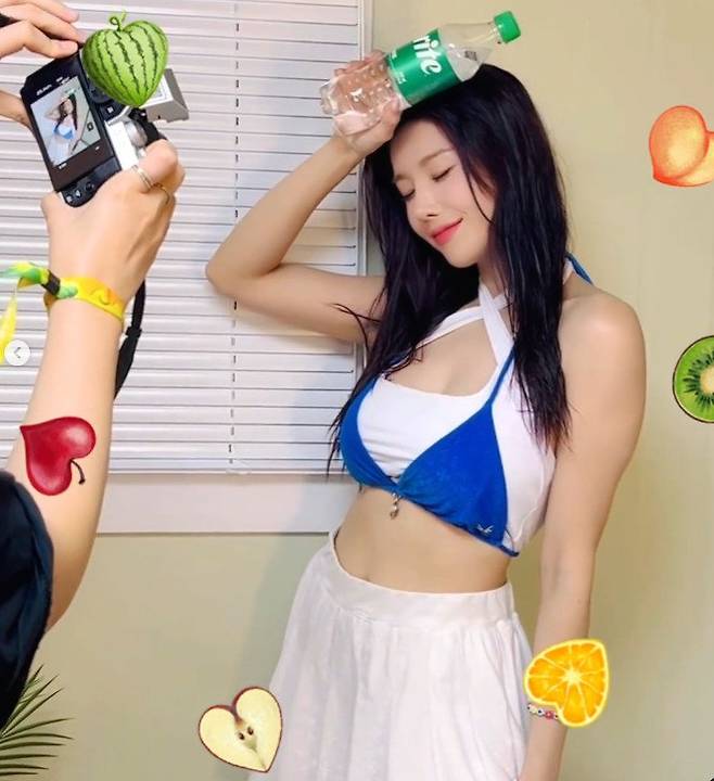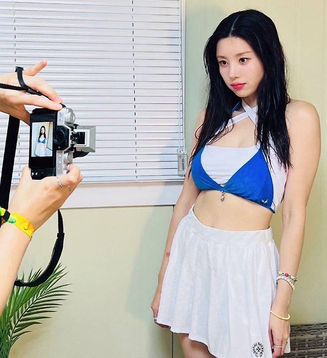 권은비는 7일 자신의 SNS에 비하인드 컷을 공개했다. 화이트 홀터넥 톱에 새파란 비키니를 레이어드한 룩으로 청순하면서도 섹시한 스타일을 완성했다.