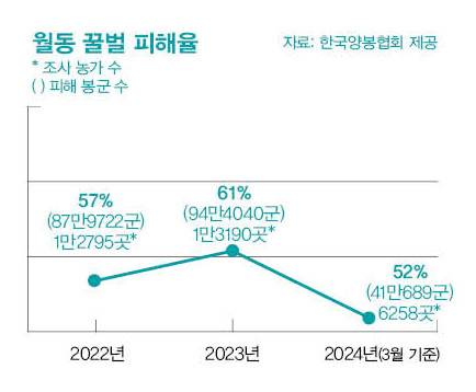 원인과 대응 방향까지 내놨지만, 이듬해 꿀벌 실종은 더 심각해졌다. 한국양봉협회에서 받은 연도별 월동 봉군 소멸 피해 현황 자료를 보면, 2023년 전국 월동 피해 봉군 수는 94만4040군(약 189억 마리)에 이른다. 피해율도 2022년 57%에서 2023년 61%로 늘었다. 2024년에도 피해는 이어지고 있다. 2024년 3월 기준 피해 군 수는 41만0689군이다. 조사 농가 수가 2022~2023년의 절반 수준인 것을 감안하면 비슷한 피해 수준이 이어지고 있는 것이다.