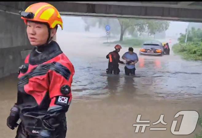 (대전=뉴스1) 김기태 기자 = 대전 소방본부 구조대원이 8일 오전 9시26분께 대전 서구 가수원동 가수원교 밑 도로에 침수된 차량에서 40대 운전자를 구조하고 있다.(대전소방본부 제공) 2024.7.8/뉴스1
