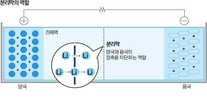 리튬이온 배터리를 구성하는 4대 소재는 양극재, 음극재, 분리막, 전해질이다. 배터리 종류에 따라 다르지만 각 소재가 배터리 셀에서 차지하는 가격 비중은 양극재 50%, 음극재 15%, 분리막 13%, 전해질 6%, 동박 5% 등이다. 4대 소재의 비중이 90%에 육박한다. 그만큼 이들 소재의 가격 경쟁력과 기술력이 배터리 셀의 상품성을 좌우한다는 의미다. 이 가운데 분리막과 전해질은 어떤 역할을 하는지 알아본다.