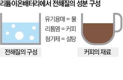 전해질은 리튬염, 유기용매, 첨가제 등 3요소로 구성됐다. 커피(리튬염)를 녹인 물(유기용매)에 설탕(첨가제)을 넣은 상태를 상상하면 이해하기 쉽다. 커피, 물, 설탕이 다르듯 리튬염, 유기용매, 첨가제도 고유의 역할과 기능이 있다. 리튬이온이 서로 밀리면서 양극과 음극으로 전달된다는 점을 고려하면, 전해질에 리튬이온이 많을수록 충·방전에 유리하다. 첫 번째 구성 요소인 리튬염을 고를 때 ‘해리’(dissociation·화합물이 분리되는 현상)가 잘 되는 소재를 채택해야 하는 이유다. 자주 쓰이는 리튬염은 LiPF6(리튬·인산·불소로 구성)다. 이온의 이동, 용해도, 화학적 안정성 등에서 다른 염보다 우수하다.
