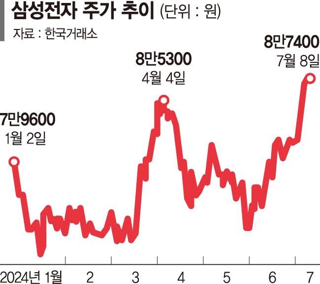 올해 초 7만9600원이던 삼성전자 주가는 지금까지 10% 가까이 오른 상태다. 지난 5월 말(7만3500원)과 비교하면 한 달여 만에 18.91% 뛰었다.