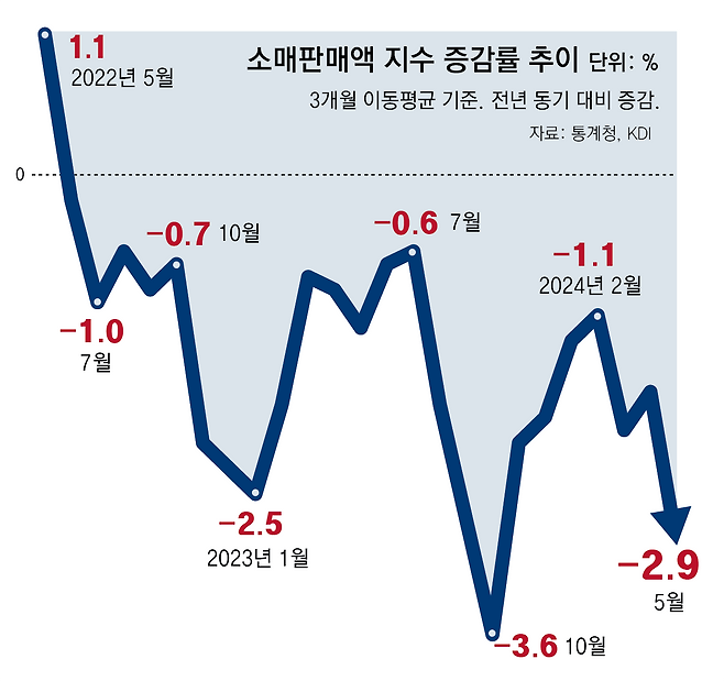 내수 침체가 이어지는 것은 고금리, 고물가 장기화로 인해 체감 경기가 잔뜩 움츠러들었기 때문이다. 5월 상품 소비를 뜻하는 소매판매는 1년 전보다 3.1% 쪼그라들었다. 대부분의 품목에서 감소 폭이 확대되면서 전월(―2.2%)보다도 감소 폭이 커졌다. 가계가 지갑을 닫으면서 소매판매는 최근 2년간 4개월을 빼고 매달 내리막을 걷고 있다.