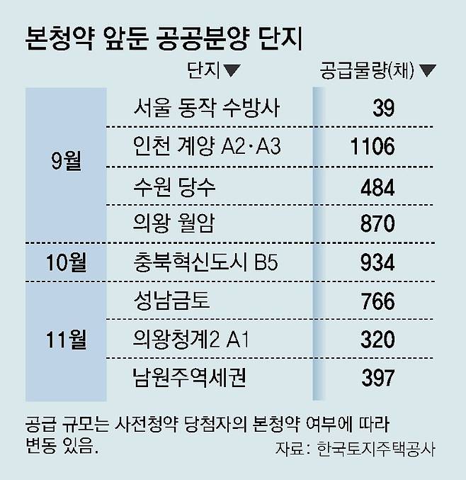 올해 말까지 예정된 공공분양 물량은 5800채다. 9월 수원 당수·의왕 월암에서, 10월 이후 충북혁신도시, 의왕 청계2, 성남 금토 등에서 본청약을 앞두고 있다. 10월 본청약 예정지였던 파주 운정3은 공사비 급등 등 사업 여건 악화로 본청약이 취소됐다.