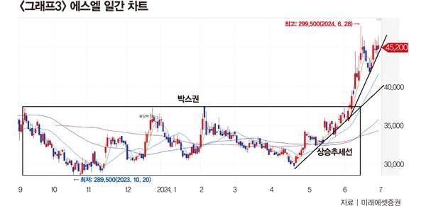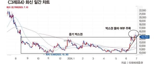 "일간 차트를 보면 지난해 8월부터 올해 6월까지 중기 박스권을 형성했다(그래프4 참조). 다만 올해 4~5월 '3중 바닥'을 형성한 후 우상향 흐름이다. 6월 중기 박스권을 돌파하는 시도를 보였지만 실패했다. 확실한 박스권 돌파 여부는 7월에 나타날 것으로 보인다."