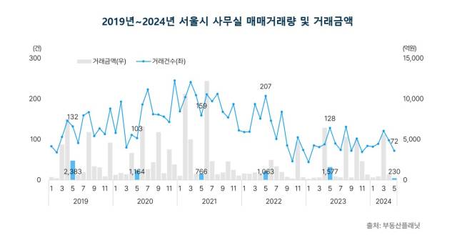 사무실 거래량도 올해 들어 최저치를 기록했다. 지난 5월 사무실(집합) 거래량은 72건으로 전월보다 약 27% 하락했다. 거래 금액도 230억 원으로 약 65% 감소했다.