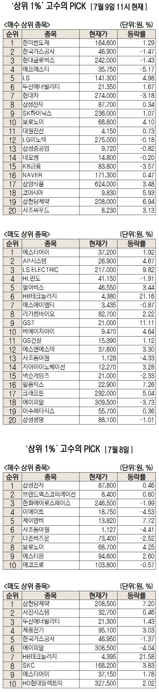 미래에셋증권에서 거래하는 고수익 투자자들이 9일 오전 가장 많이 순매수한 종목은 한미반도체(042700)로 나타났다. 한국가스공사(036460), 현대글로비스(086280), 에프에스티(036810), LS(006260) 등도 순매수 상위권에 이름을 올렸다.