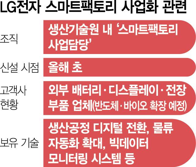 LG전자는 스마트팩토리 사업을 기업간거래(B2B) 사업의 한 종류로 키우고 있다. 올해 초 생산기술원 내에 ‘스마트팩토리사업담당’을 신설한 후 공장 구축 기술과 운영 솔루션 등의 무형자산을 사업화하는 과정이 이뤄지고 있다. 생활가전부터 공조 설비, 전장, 로봇 등 다양한 제품군에서 제조 역량을 갖춘 것이 강점이다.