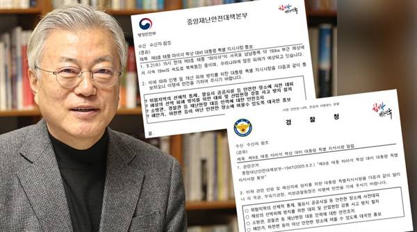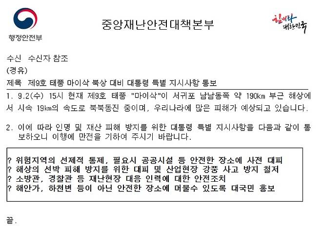 | ▲ 2020년 9월 2일 문재인 대통령의 '제9호 태풍 마이삭 북상 대비 대통령 특별 지시사항 통보'. |