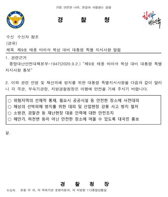 <충북인뉴스>는 문재인 전 대통령 재임시절인 2020년 9월 2일 중앙재난안전대책본부와 경찰청이 작성한 '제9호 태풍 마이삭 대비 대통령 특별 지시사항 (알림)통보' 공문을 확인했다.
