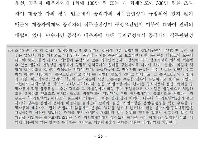 특히 이들 재판관은 "공직자 등이 그 배우자를 통하여 금품 등을 우회적으로 수수하는 통로를 차단하는 가장 확실하고 효과적인 수단은, 수수 금지 금품 등을 수수한 공직자 등의 배우자를 직접 처벌하는 것"이고 "배우자를 처벌하더라도 형평에 반한다고 할 수 없다"고 밝혔다.
